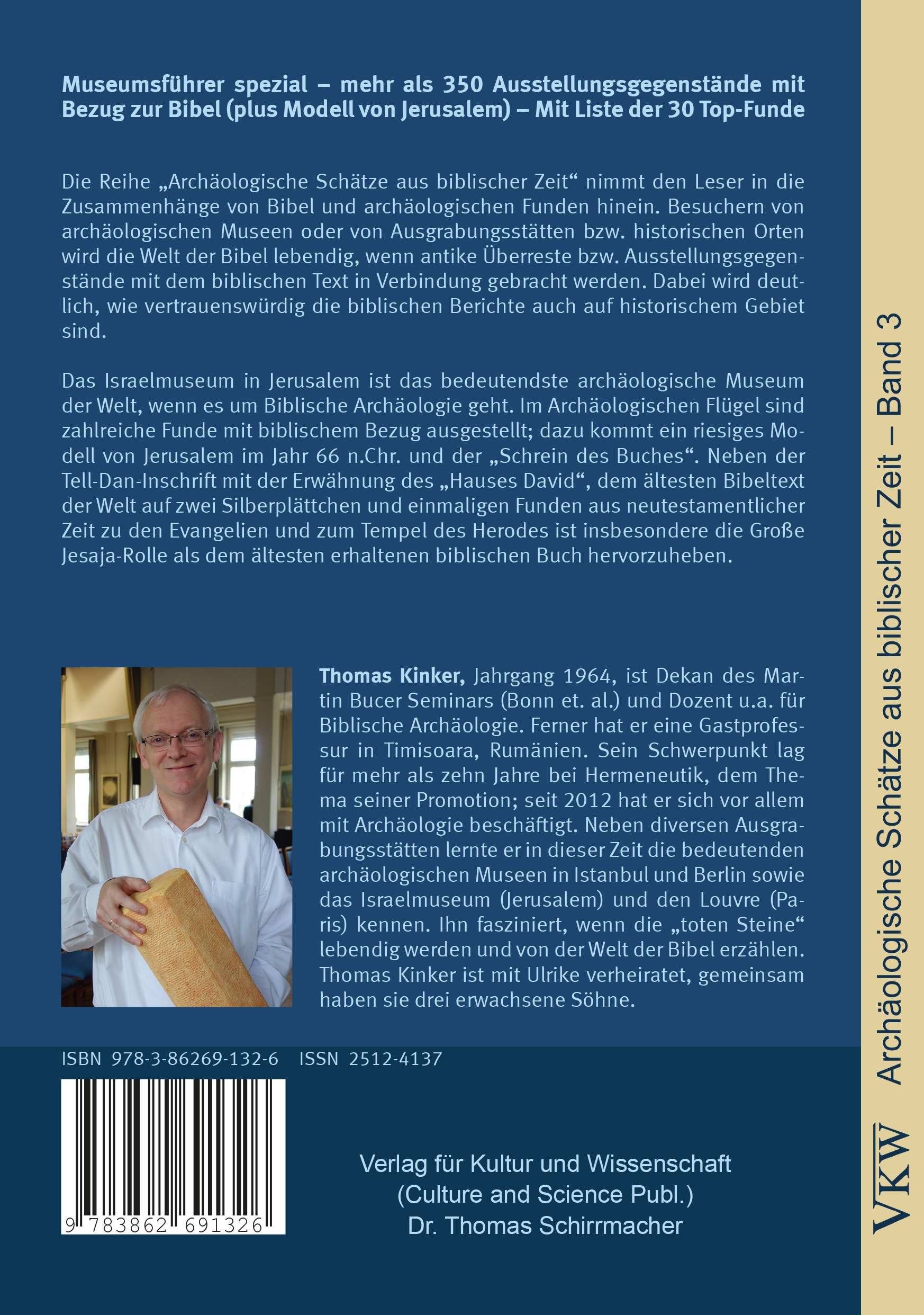 Thomas Kinker. Jerusalem: Mit der Bibel durch das Israelmuseum: Museumsführer spezial. Archäologische Schätze aus biblischer Zeit, Band 3. Verlag für Kultur und Wissenschaft: Bonn, 2017. 662 S. Pb. 34.80 â¬. ISBN 978-3-86269-132-6.